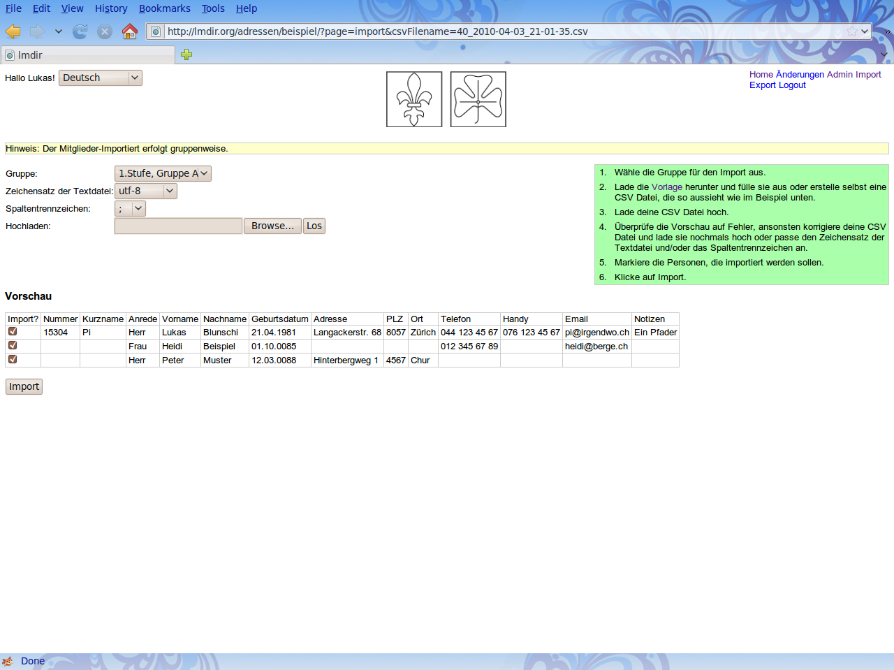 Ein Admin kann Mitglieder mit Hilfe von CSV Dateien importieren. So können am Anfang sehr schnell die Daten Basisdaten angelegt werden.